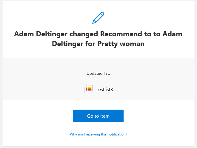 This is just a list I created to test thing out with, but it will serve our purpose.. If you look at the image above you see that I created a people column called “Recommend to”. Anyone with access to this list can view who I recommended a movie, but wouldn’t it be great if the person that I recommended it to get a notification? So what are our options?