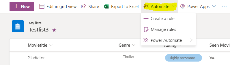 I opened the list “Testlist3” which contains a list of movies. I’ve created additional columns in order to populate different values for each movie like genre, rating etc.