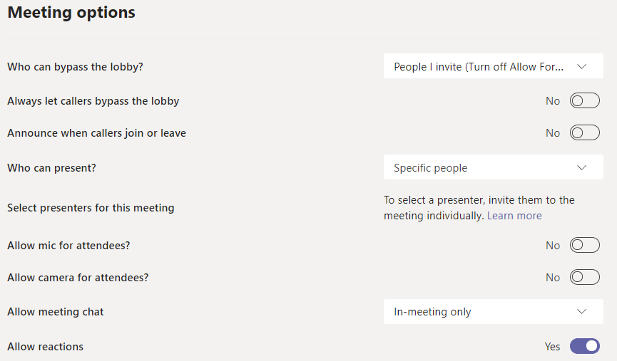 These meetings options are available for all Teams meetings and not something that’s exclusive for the Webinar feature, but these settings are set as default for you when creating a Teams Webinar. These can of course also be changed if you prefer a different setup!