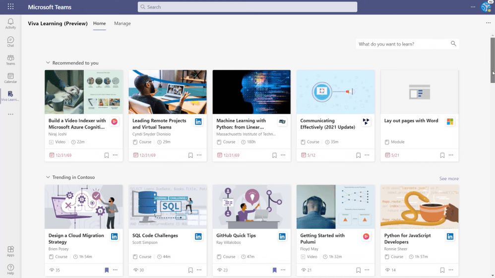 Like the other modules, Viva Learning will be used mainly from an app within Microsoft Teams, from where users in your organization can access learning and training content from multiple sources.
