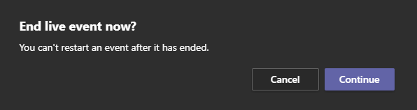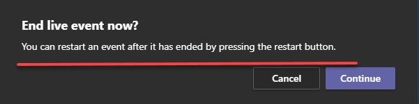 After clicking “Continue” the Live Event ends, and the stream going out to attendees stops. To then restart the Live Event, you have to go to the ellipsis (…) at the top and click “Restart Event”