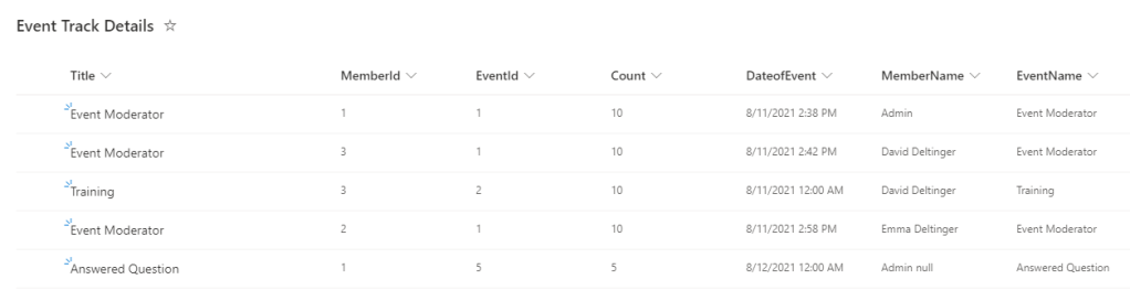 By looking at the third SharePoint list “Event Track List”, you can view all activities/events recorded, by whom and when. You can see the custom created “Answered Question” activity I recorded previously as well: