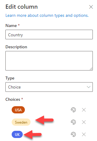 Above, I added a new choice (UK) for the “Country” column. Now, when adding new program members from the app in Teams, we can see the new options: