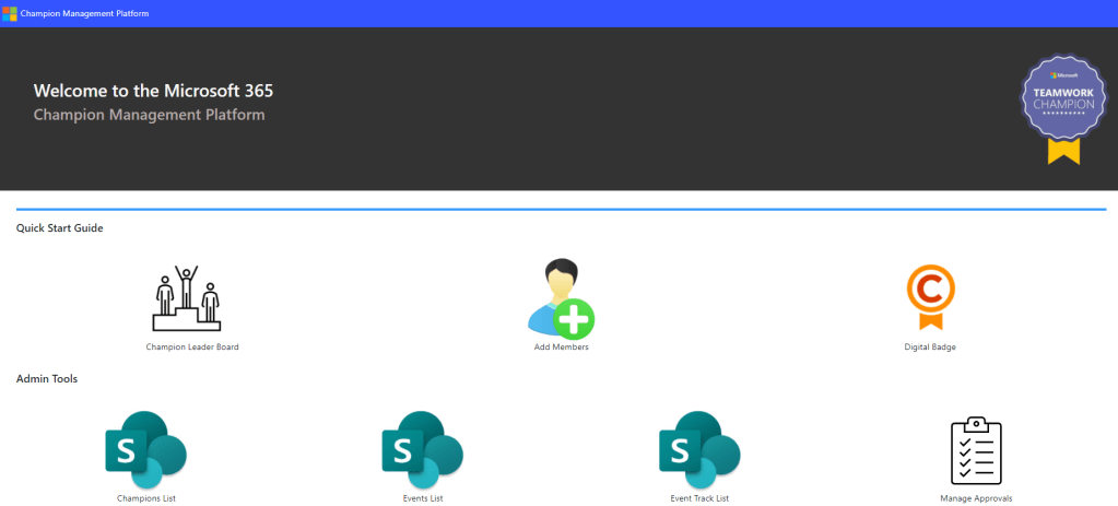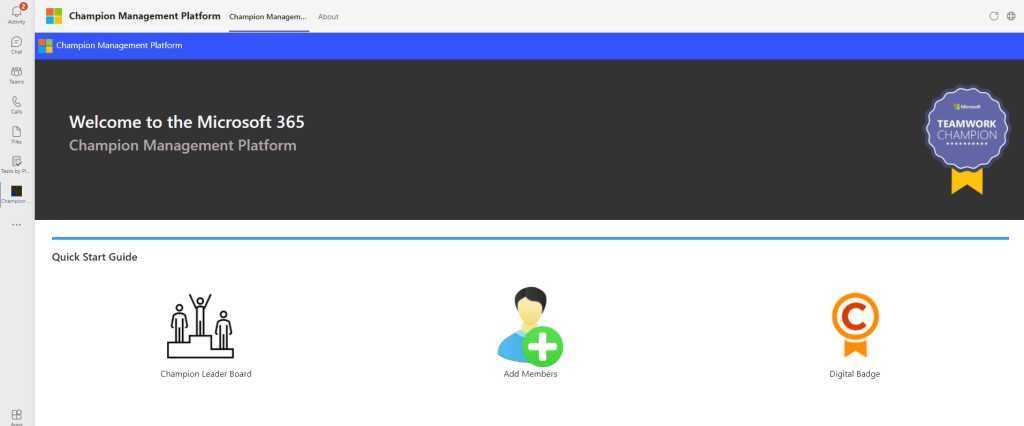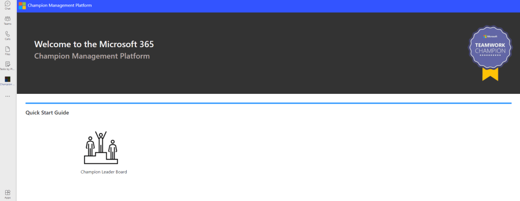 Recently Microsoft released a toolkit called Champions Management Platform (CMP). It’s a solution that is leveraging the SharePoint framework and can be installed as an app in Microsoft Teams. From here you can manage your champions, inspire them to do their role even better by utilizing gamification, as well as a place to find champions within certain topics or geographical areas in your organization.