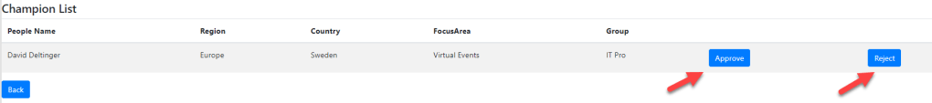 This view differs from what others see, much in regards to the bottom icons. As a manager you have access to the SharePoint lists created, and a link to each is added from within the app itself. The “Manage Approvals” icon is used for managers to approve/reject requests to join the champions program (from an app perspective). A request can be made from other champions or tenant users. ( If they have access to the app)