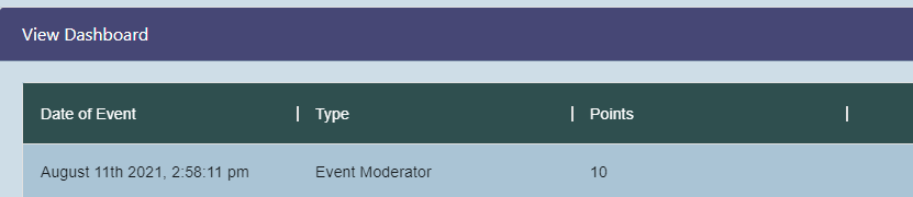 The “View Dashboard” part shows you what activities you have added (performed), what date, type and how many points you earned by completing it: