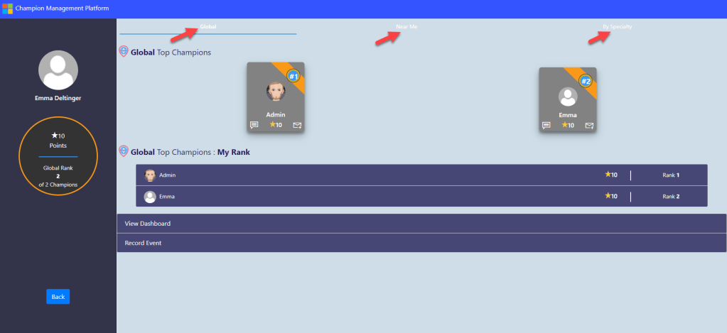 - Champions can access the Leaderboard to record events/activities, see theirs and others current ranking and number of points earned. As mentioned before, the leaderboard can also be used to track down other Champions based on location and speciality